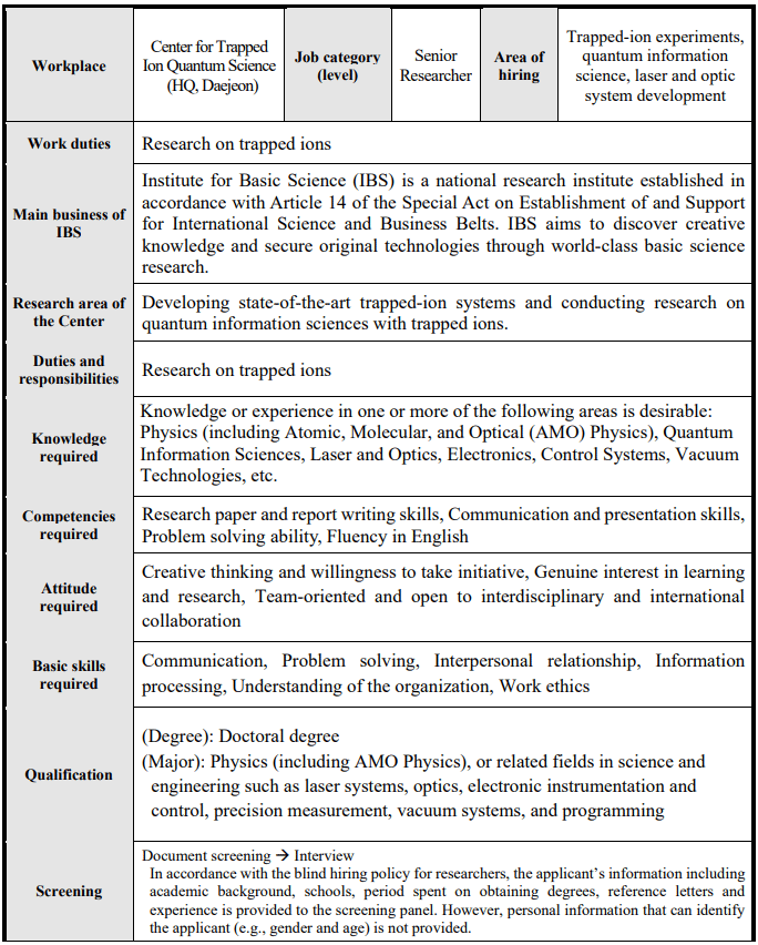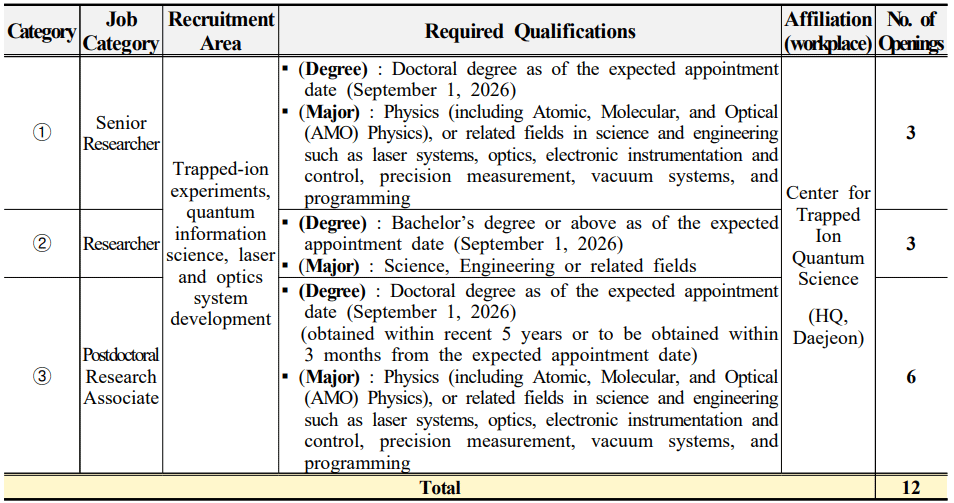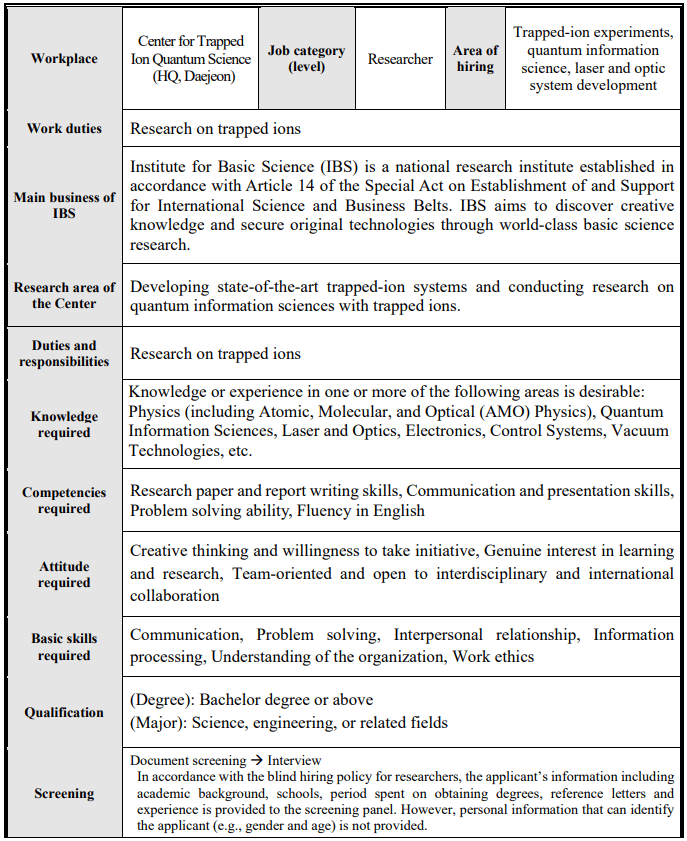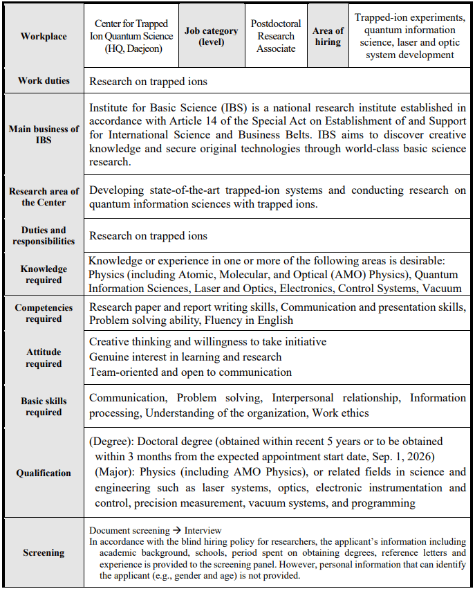 韩国基础科学研究院(IBS)囚禁离子量子科学中心2026年研究岗位招聘公告