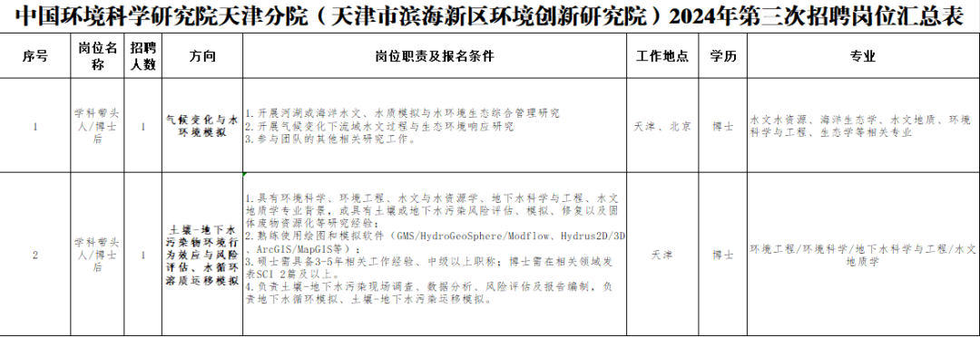 天津市滨海新区环境创新研究院(中国环境科学研究院天津分院)2024年招聘博士后、学科带头人启事